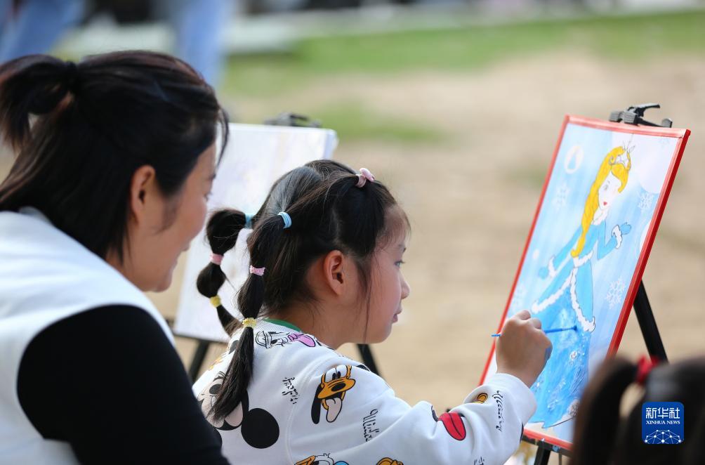 10月3日,家长陪着孩子在山东省滕州市弘道公园学习绘画。新华社