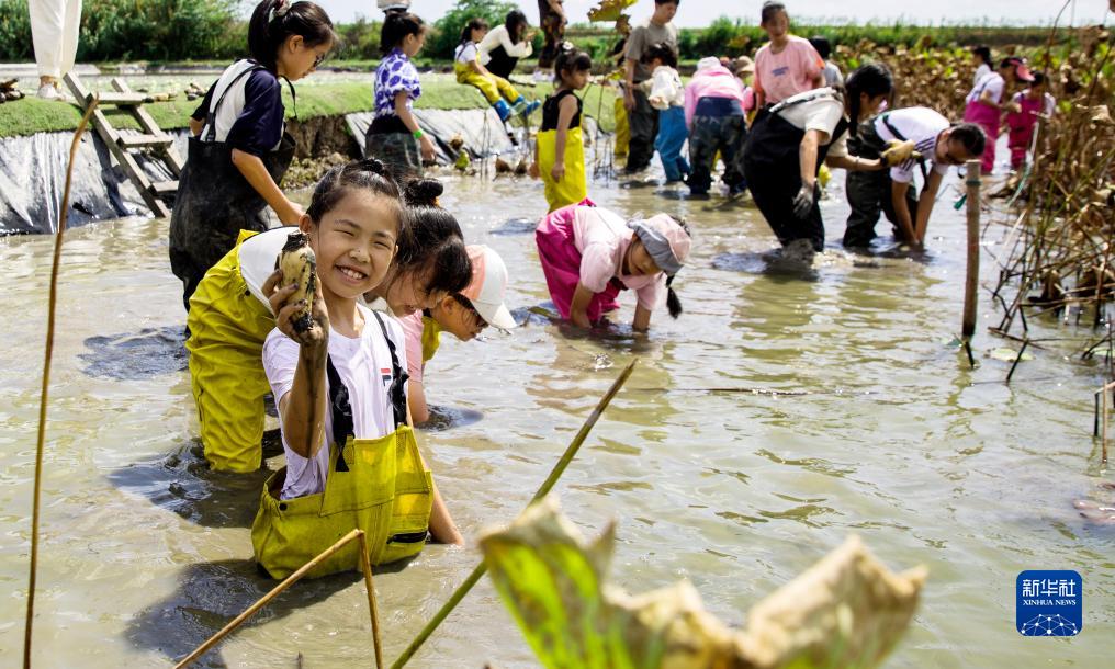 10月3日,小朋友在浙江省宁波市北仑区郭巨街道古镇莲园体验采收莲藕。新华社