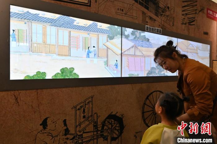 10月3日,在内蒙古呼和浩特市科技馆内,小朋友了解丝绸工艺流程。 中新网