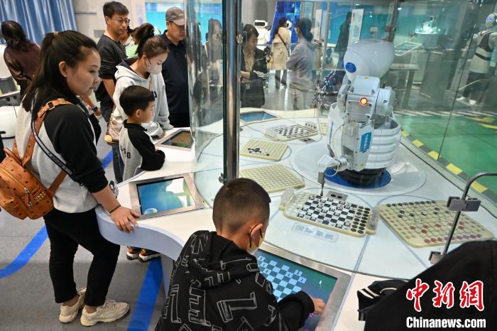 10月3日,在内蒙古呼和浩特市科技馆内,小朋友与机器人对弈棋类。 中新网