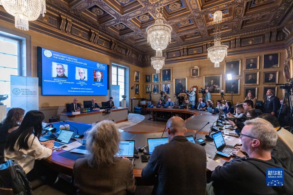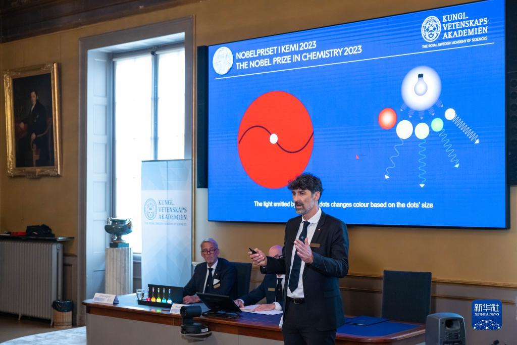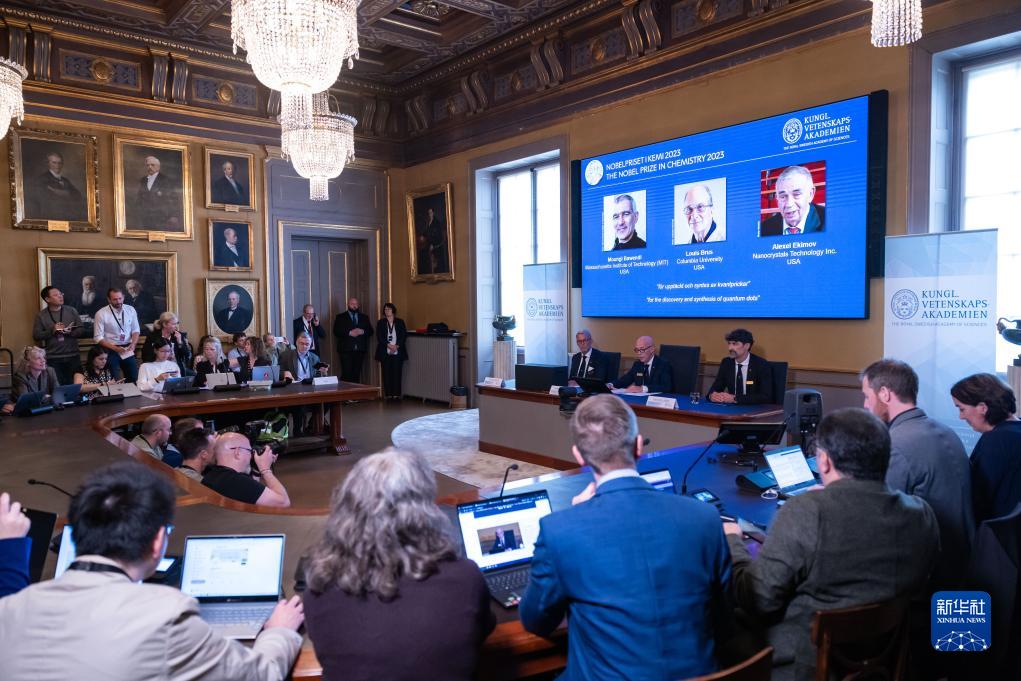 10月4日在瑞典斯德哥尔摩拍摄的2023年诺贝尔化学奖公布现场。