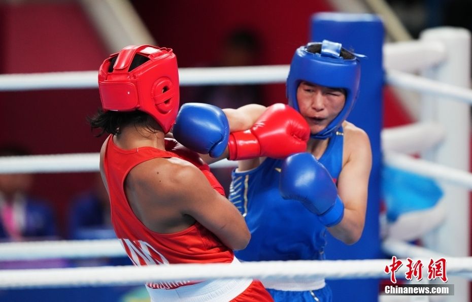 10月3日,杭州第19届亚运会拳击女子50公斤级决赛在杭州体育馆举行。中国选手吴愉(红方)5比0战胜泰国选手楚他玛·拉沙(蓝方)获得金牌。中新网