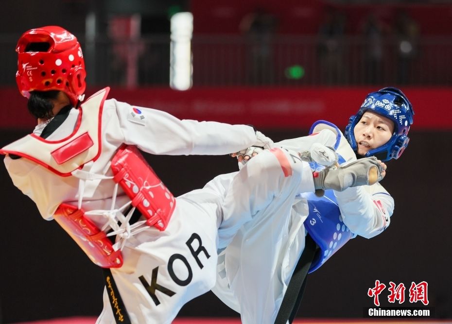9月26日,杭州第19届亚运会跆拳道女子57公斤级半决赛在临安体育文化会展中心体育馆举行,中国选手骆宗诗(蓝方)战胜韩国选手金宥珍晋级决赛。中新网