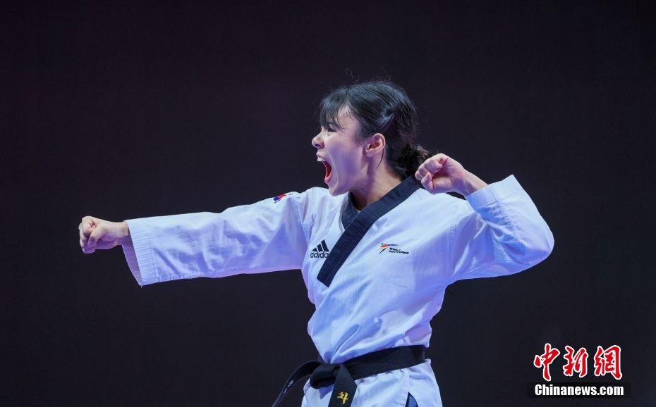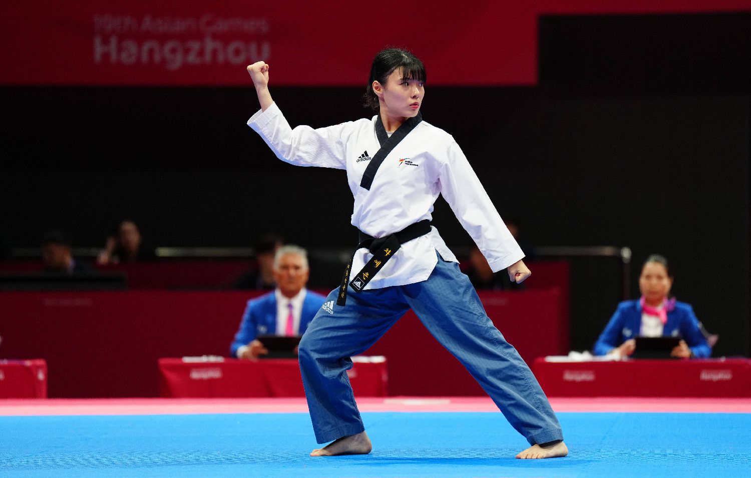 9月24日,杭州第19届亚运会跆拳道女子个人品势金牌赛在临安体育文化会展中心体育馆举行。韩国选手车艺恩战胜日本选手丹羽结子获得女子个人品势金牌。图为车艺恩在比赛中。中新网