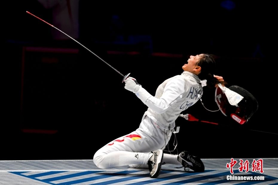 9月25日晚,杭州第19届亚运会女子个人花剑决赛在杭州电子科技大学体育馆举行,中国选手黄芊芊以15比8战胜日本选手上野优佳,夺得冠军。图为中国选手黄芊芊夺冠后呐喊庆祝。中新网