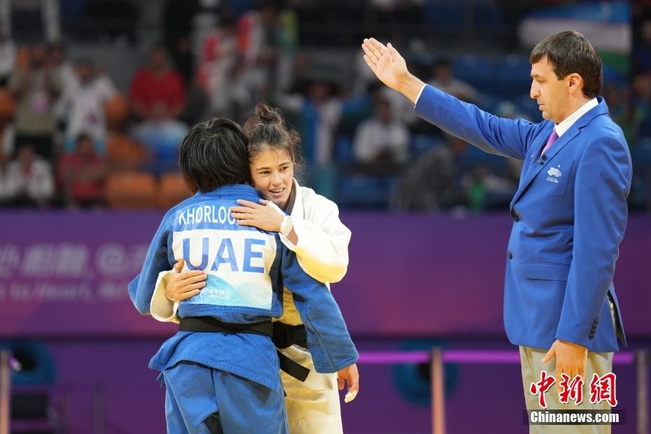 9月24日,杭州第19届亚运会柔道女子52公斤级冠军争夺赛在萧山临浦体育馆举行。乌兹别克斯坦选手季约拉·克尔迪约罗娃(白方)战胜阿联酋选手比什蕾勒特·胡尔卢杜伊获得金牌。图为季约拉·克尔迪约罗娃赛后与对手拥抱。中新网