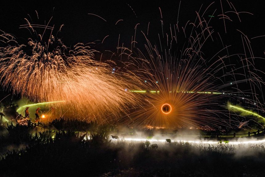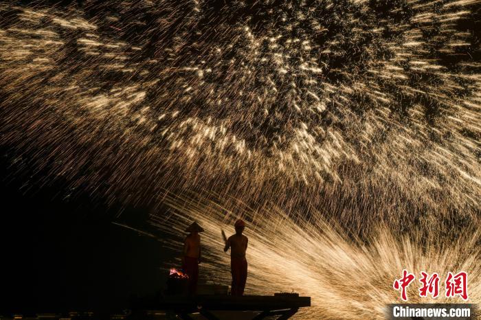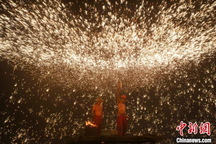艺人们置身于铁花中。中新网