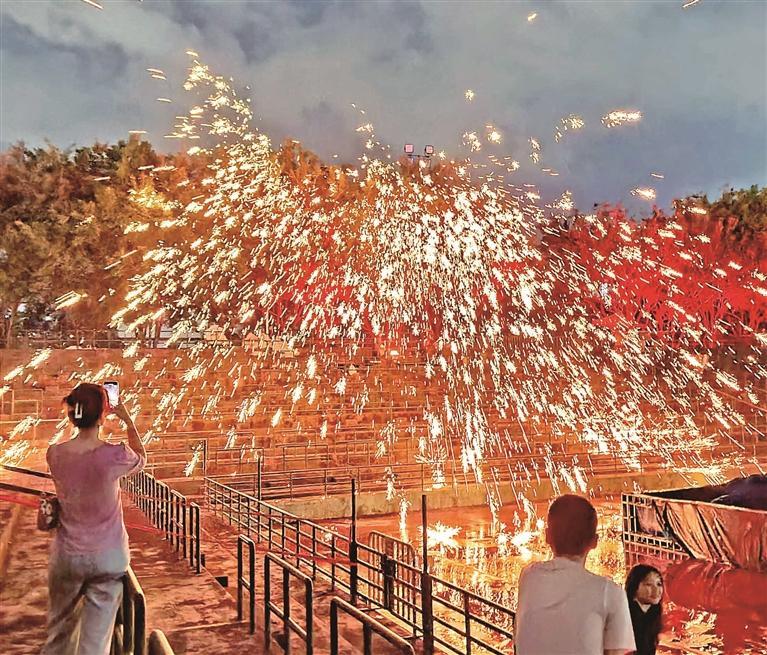 9月24日晚,在深圳观澜湖生态运动公社景区表演区,一场非遗打铁花表演引来阵阵喝彩。图为游客欣赏精彩的非遗打铁花表演。中秋国庆8天长假期间,“打铁花”节目将于每晚8时20分在景区上演,欢迎游客来打卡。《宝安日报》