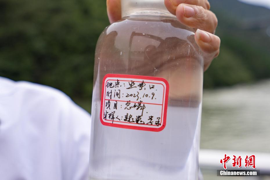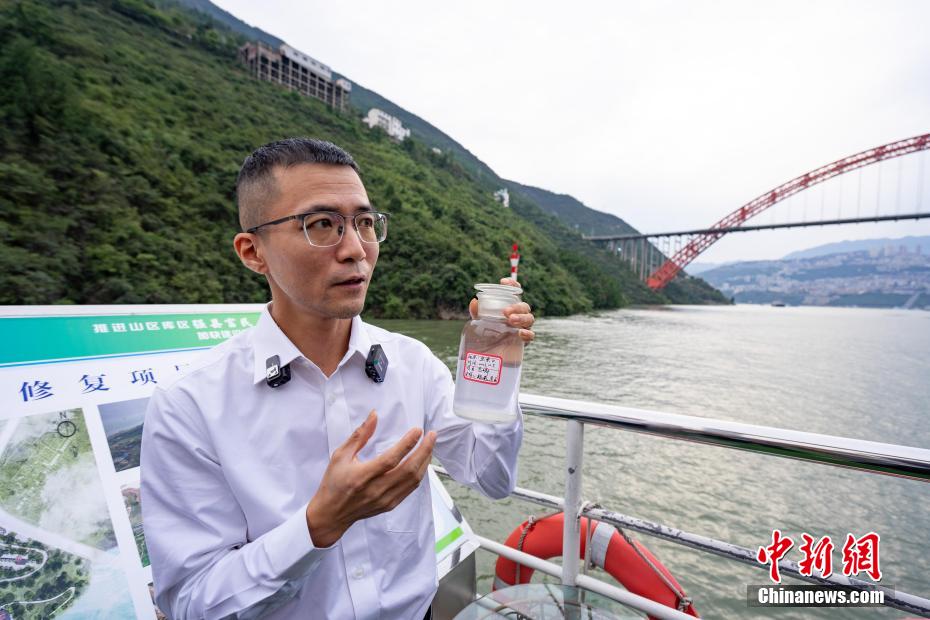 10月9日,重庆市巫山县环境监测站副站长魏嵬展示当天下午在巫峡口抽取的水样。中新网