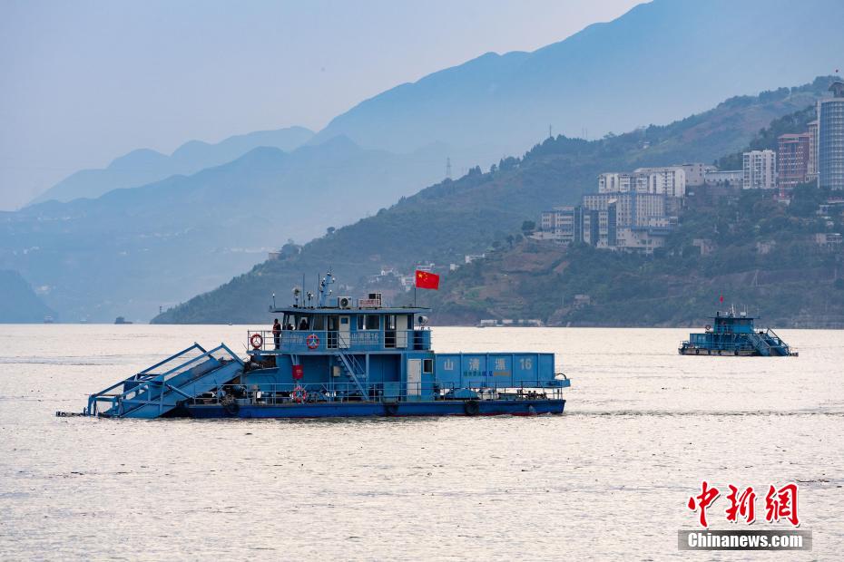 10月9日,重庆市巫山县城管局机械化清漂船在长江干流巫山段清漂作业。中新网