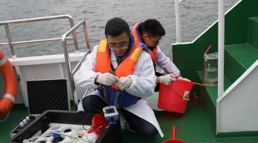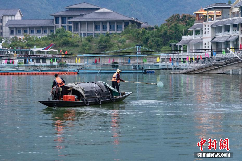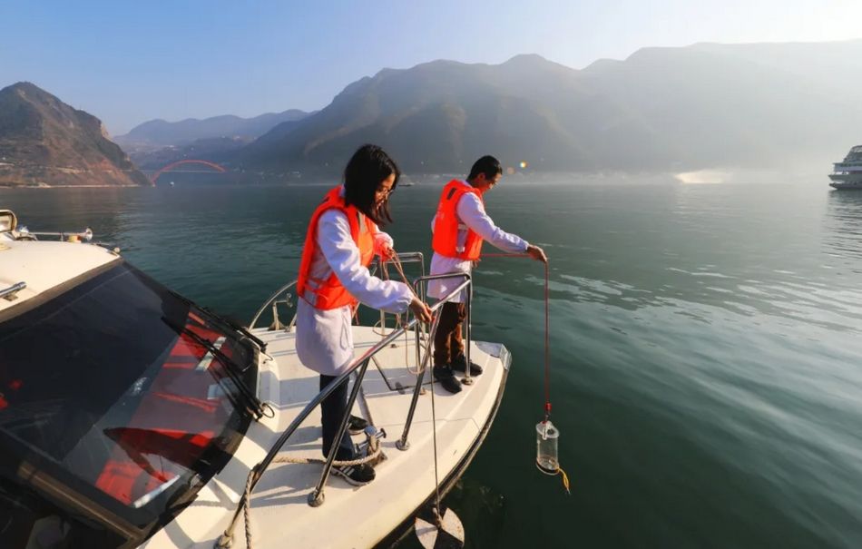 为确保航道航运安全和景区景观,被誉为“清道夫”的清漂队员,采取以机械化清漂为主、人工打捞为辅的方式,对水上漂浮物进行紧急清理,并集中进行转岸处理。图为环境监测人员正在长江采取水样。中国网
