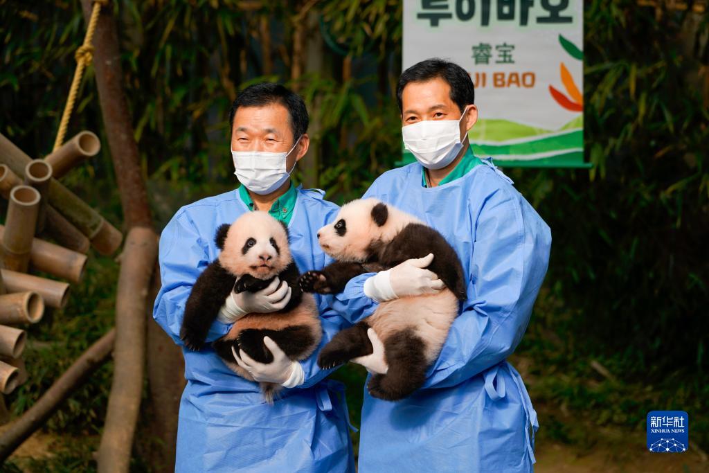 这是今年在海外出生的首对大熊猫幼崽,也是在韩国诞生的首对大熊猫双胞胎。图为大熊猫双胞胎幼崽“睿宝”(左)与“辉宝”亮相。中新网