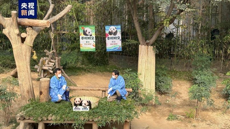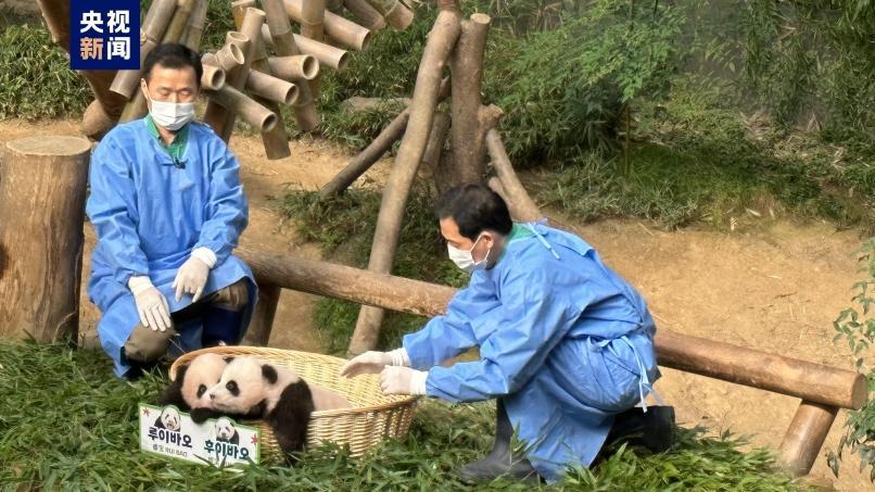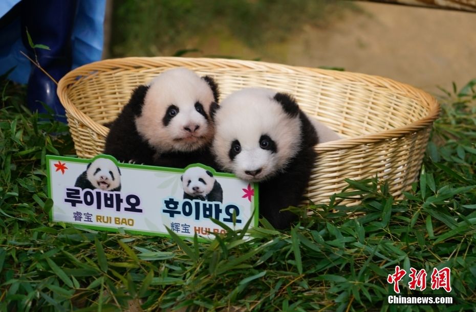 此前,韩国爱宝乐园宣布举办征名活动来确定两只熊猫幼崽的名字,并要求备选名字必须带有“宝”字,以体现“宝家族”身份。经过两轮网上征名活动,双胞胎宝宝最终命名为“睿宝”和“辉宝”。大陆央视新闻客户端