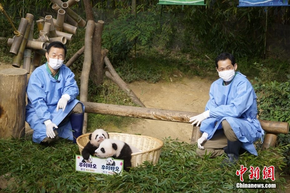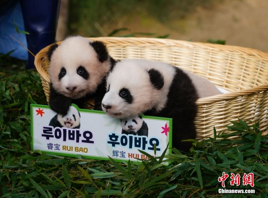 10月12日,在韩国京畿道龙仁市,旅韩大熊猫“爱宝”“乐宝”的双胞胎宝宝首次公众见面会举行,宝宝们的名字也同时公布:“睿宝”“辉宝”。这对雌性双胞胎幼崽于今年7月7日诞生。