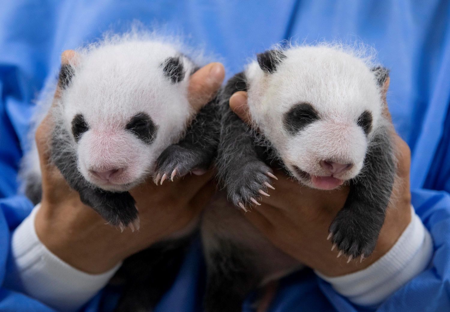 工作人员怀抱大熊猫双胞胎幼崽“睿宝”(左)与“辉宝”与公众见面。新华社
