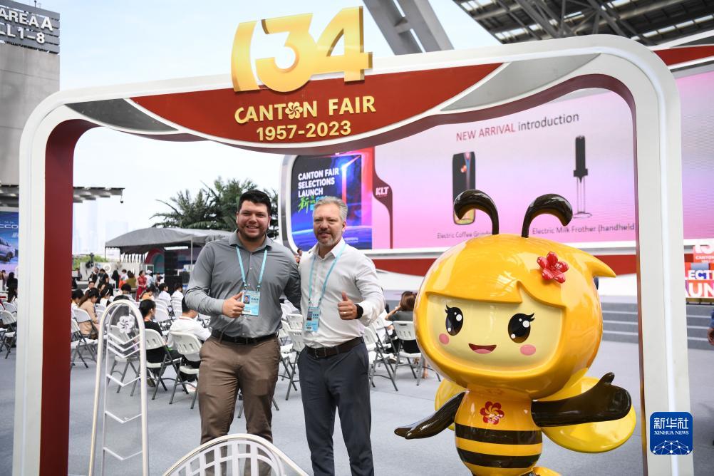10月15日,来自巴西的采购商在广交会上合影。新华社