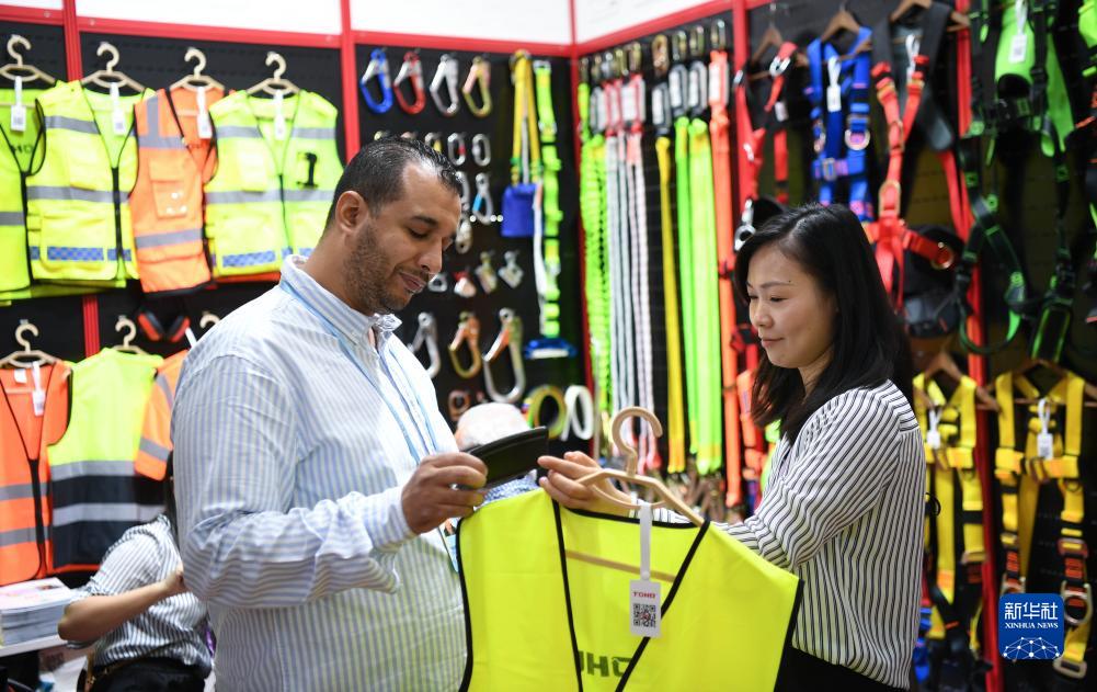 10月15日,采购商在了解劳保用品。新华社