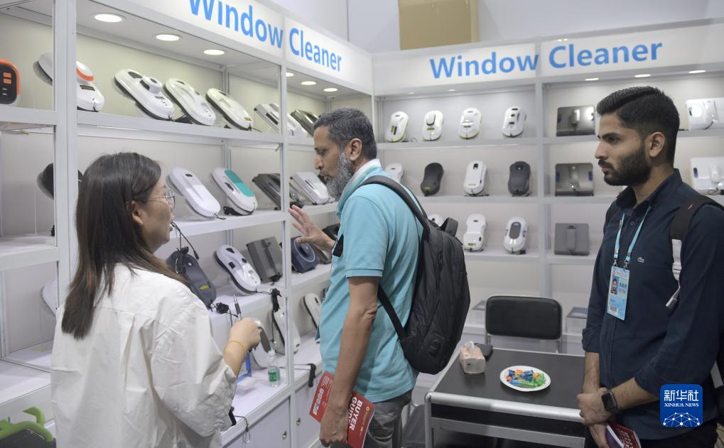 10月15日,家用电器参展商(右)向采购商介绍产品。中新网
