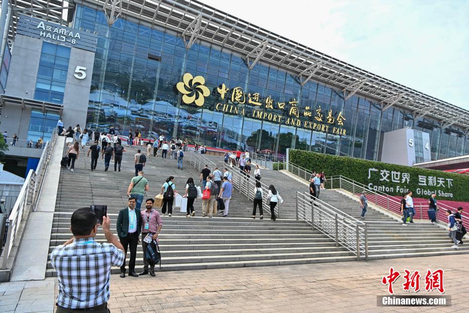 10月15日,参展商在广交会展馆外合影。中新网