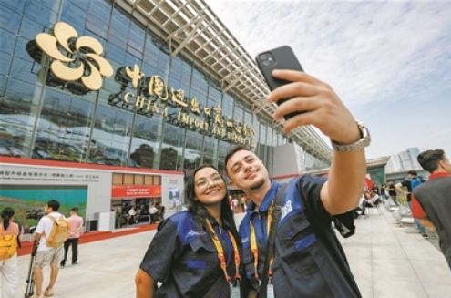 来自巴西的采购商自拍留影。《广州日报》