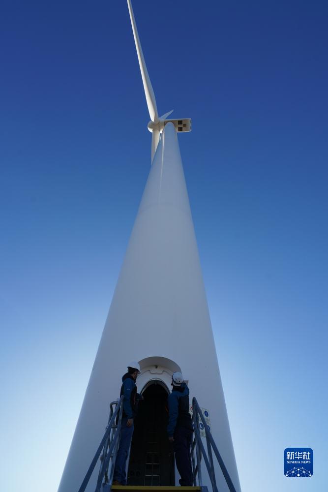 金风科技阿根廷分公司董事总经理凌培田说,金风科技通过高可靠性和高效率的风机、优质的运维服务和扎实的属地化经营,备受当地客户青睐。图为6月12日,在阿根廷丘布特省马德林港的罗马布兰卡一期风电场,风机运维人员检查设备运行状况。