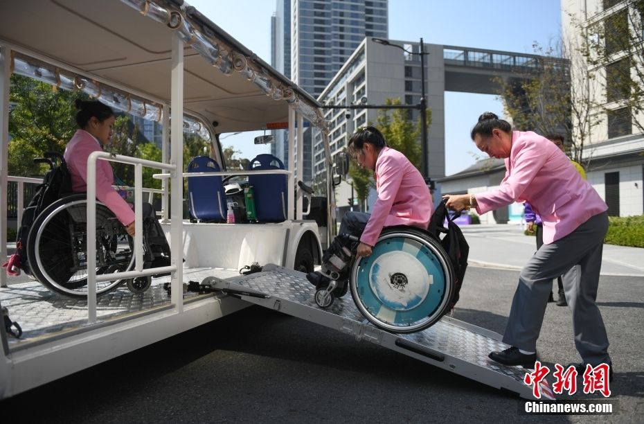 亚残运村是全体运动员和随队官员的赛时家园,也是杭州亚残运会最大的非竞赛场馆,目前所有功能区域均已设置到位,无障碍设施建设和提升已全面完成。图为10月16日,运动员在亚残运村使用无障碍接驳车。中新网