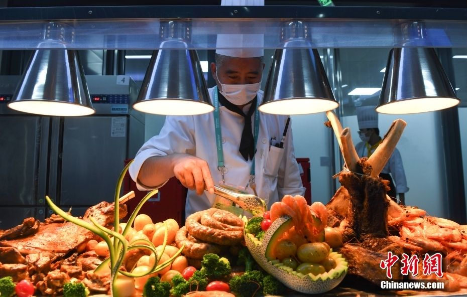 10月16日,亚残运村运动员餐厅工作人员在准备食物。中新网