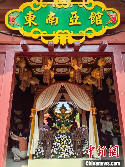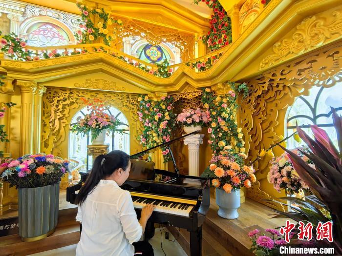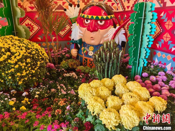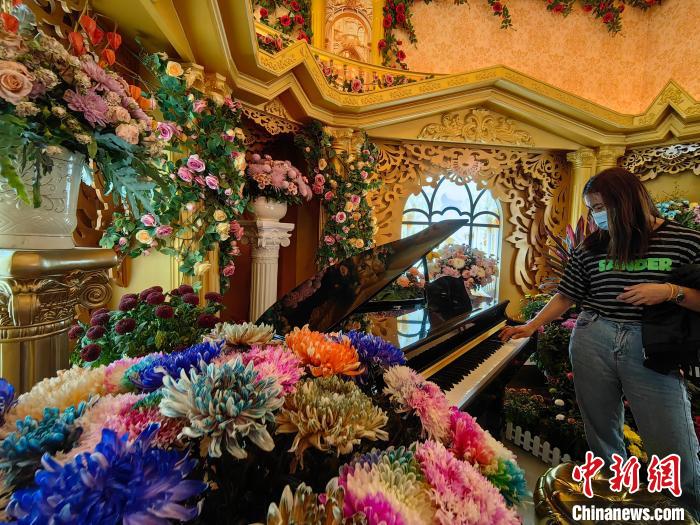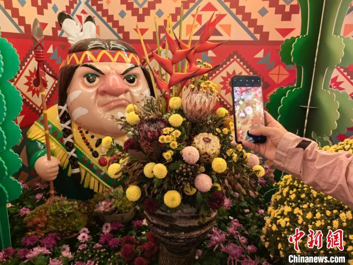 10月18日,第十二届国际菊花展惊艳亮相,吸引众多游客前往观赏。图为游客在亚洲馆打卡自拍。中新网