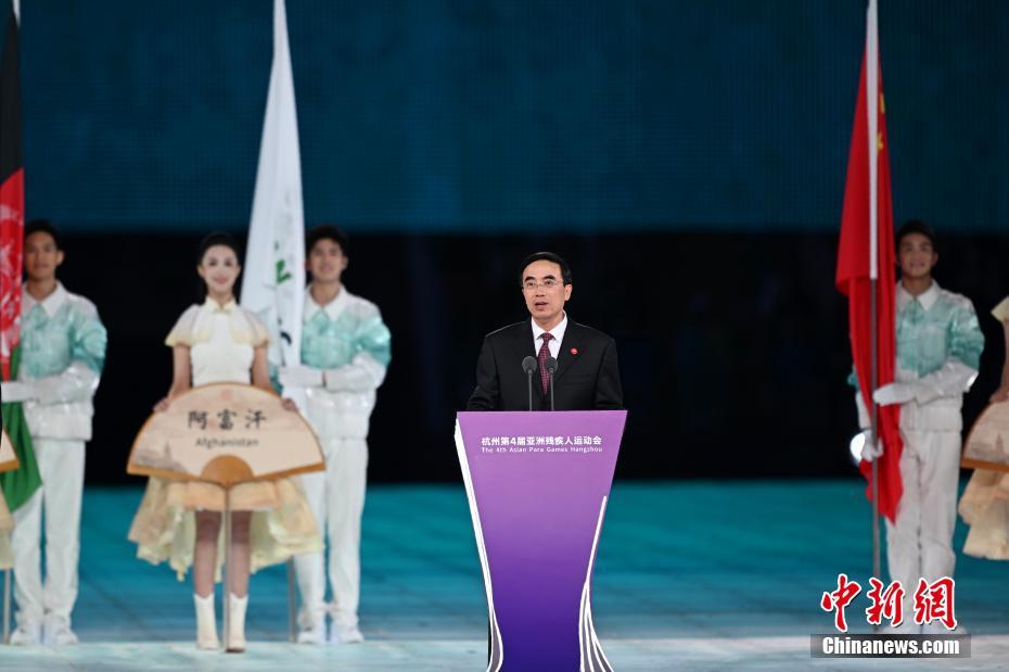 杭州第4届亚州残疾人运动会组委会主席、中国残疾人联合会主席程凯在开幕式致辞。中新网