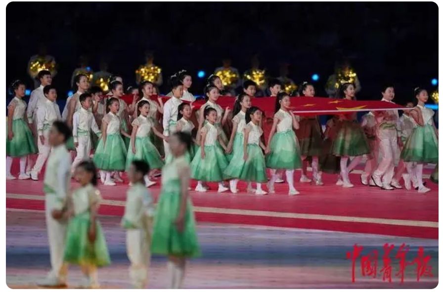听障儿童手执中华人民共和国国旗入场,一旁,两名佩戴人工耳蜗的听障儿童与两名健全儿童一同演唱《我的祖国》。中国青年网
