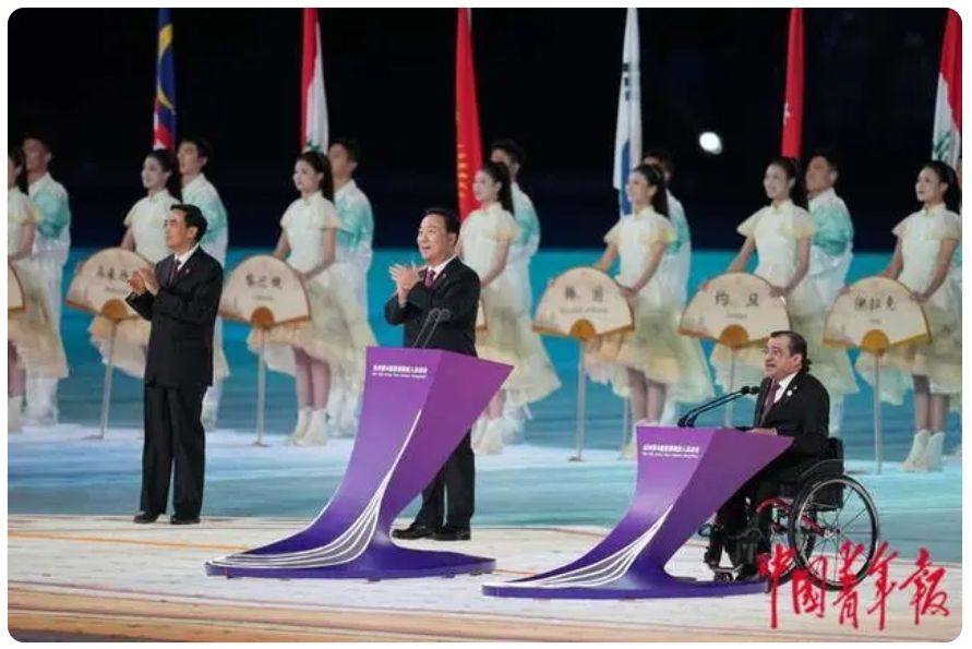 杭州第4届亚洲残疾人运动会开幕式上,亚残奥委员会主席马吉德·拉什德(右一)致辞,他用中文说道:“杭州真是一个美丽的地方。”中国青年网
