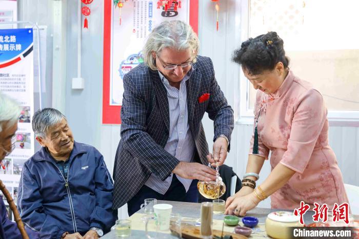 10月23日是中国传统节日重阳节,中国各地举行丰富多彩的活动,与老人们一起喜迎传统佳节。 10月20日,“相聚重阳节 体验汉文化”主题活动在山东省青岛市李沧区举行。图为茶艺师协助外国友人体验中国茶艺。中新网
