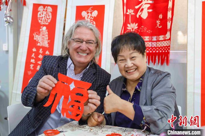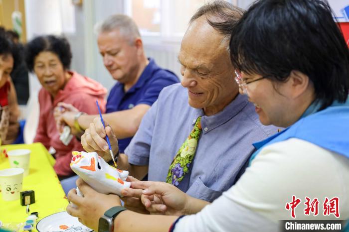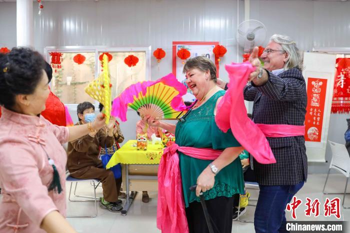 活动邀请了来自南非、英国、法国等国家的外国友人,与现场的老年人通过体验书法、剪纸、扭秧歌、茶道等传统民俗,共同迎接重阳节,感受中国传统文化的魅力。图为外国友人体验扭秧歌。中新网