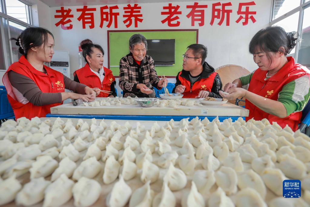 10月22日,志愿者在河北省遵化市东陵满族乡互助幸福院与老人一起包饺子。新华社