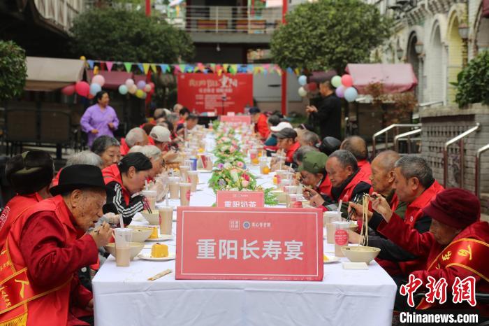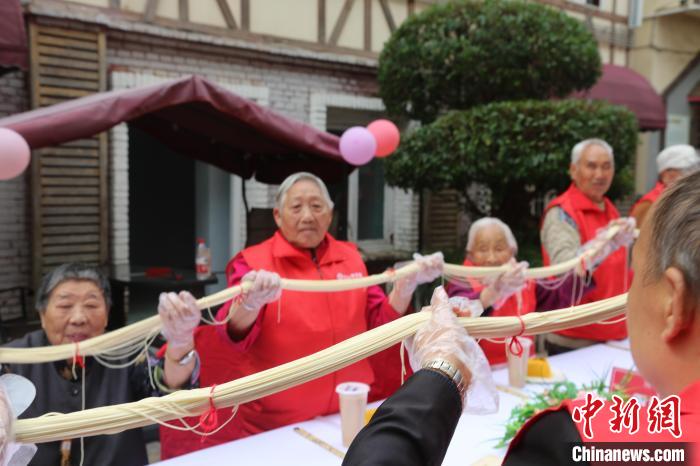 在重庆涪陵红酒小镇养老院的活动现场,老人们正在吃长桌面条宴。中新网