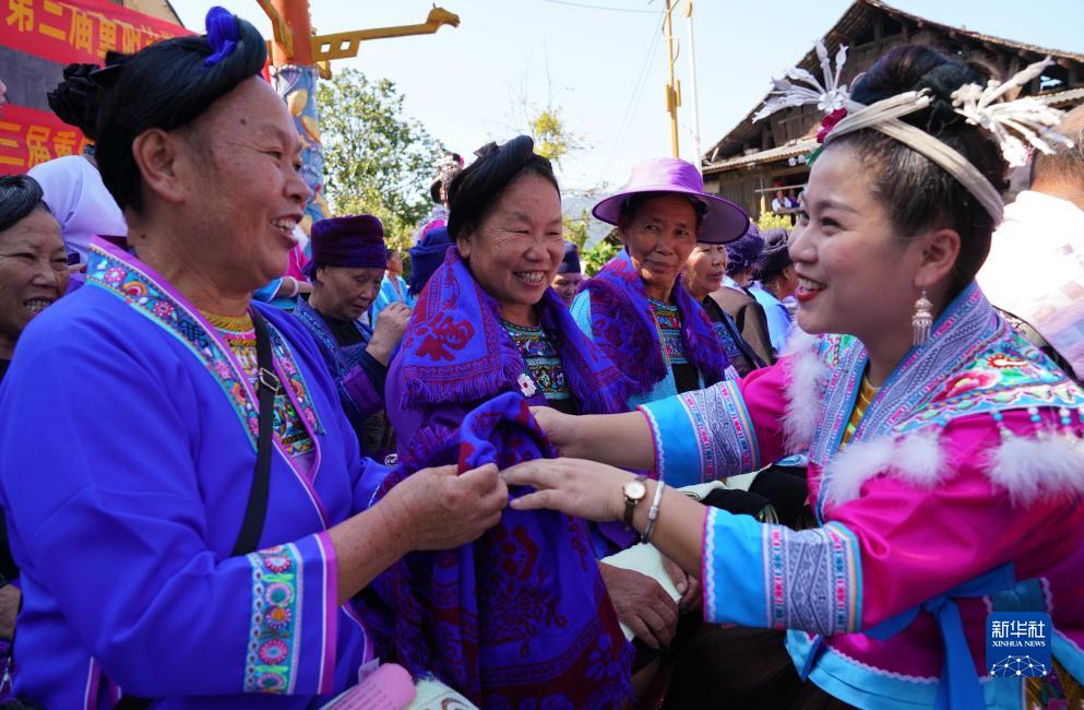 10月21日,在广西融水苗族自治县白云乡龙岑苗寨,外嫁女给老人赠送过节物品。新华社