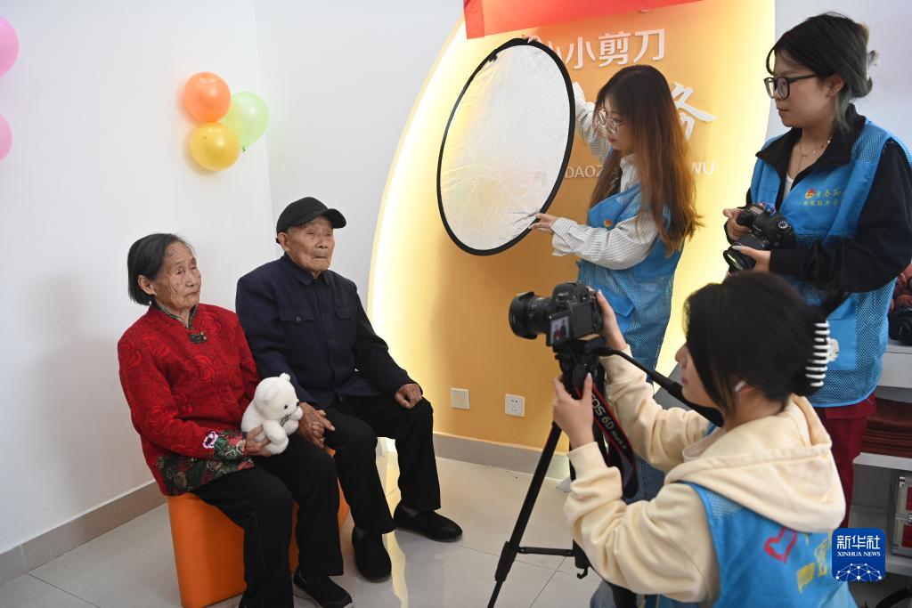 10月22日,在山东省聊城市东昌府区闫寺街道镇南新村,聊城大学传媒技术学院大学生志愿者为89岁的秦保平(左二)和88岁的石玉香(左一)拍摄“结婚照”。新华社