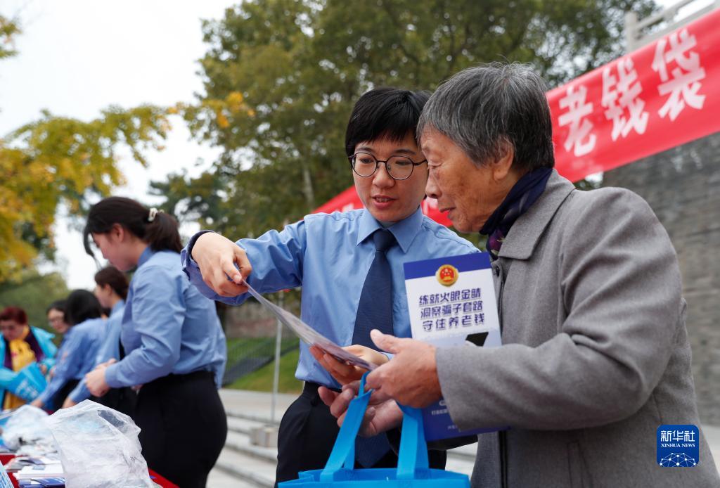 10月22日,江苏省兴化市人民检察院法治宣讲团的工作人员在公园向老年人讲解反诈骗知识。新华社