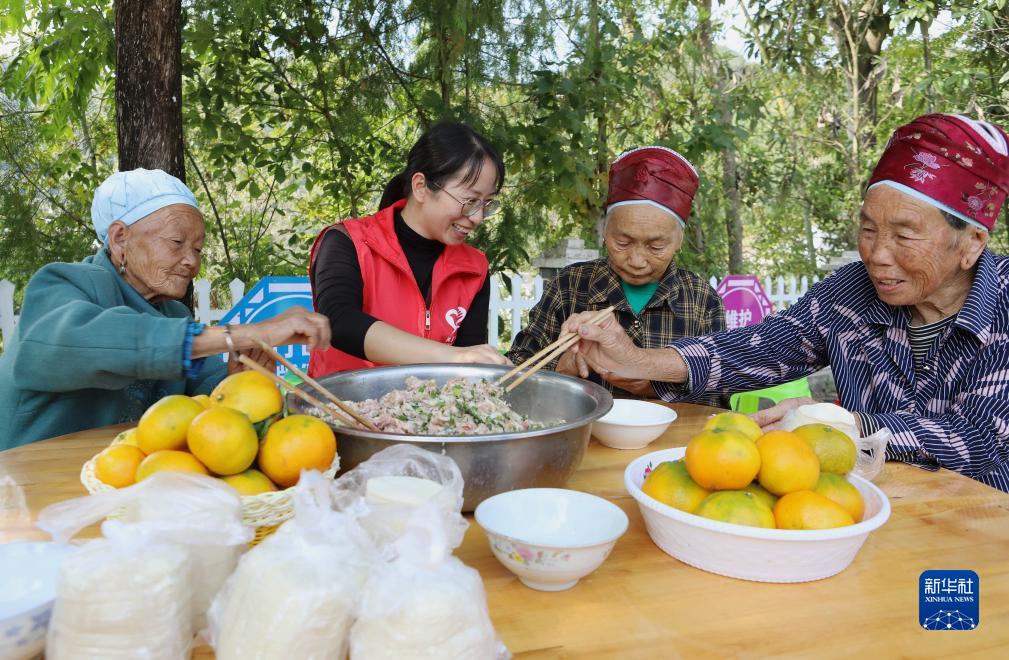10月22日,在贵州省黔东南苗族侗族自治州施秉县甘溪乡高碑村举办的“孝亲敬老·浓情重阳”活动中,志愿者与老人们一起包饺子。新华社