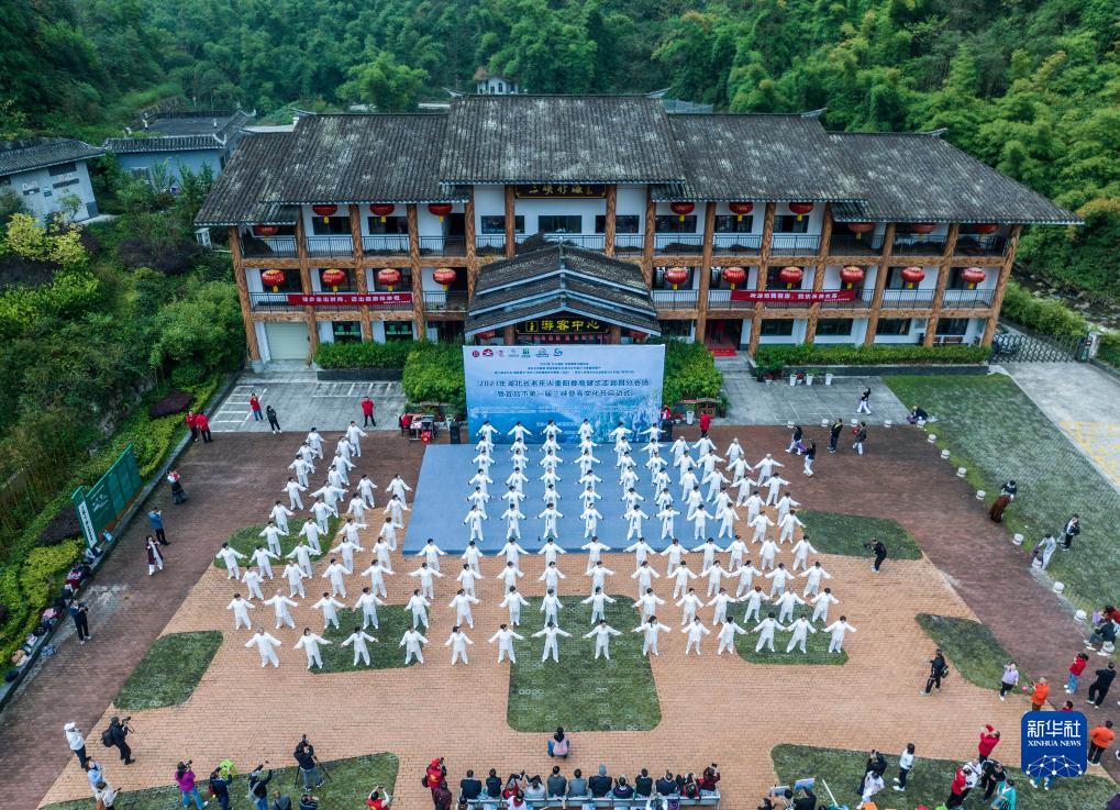 10月22日,在湖北省宜昌市秭归县三峡竹海生态风景区,参加重阳登高活动的老年人在进行太极拳表演(无人机照片)。新华社