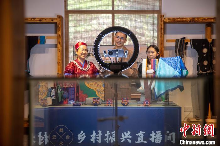 贵州省高级工艺师、省级非遗苗绣传承人龙禄颖2006年返回家乡贵州省施秉县双井镇龙塘苗寨,走上了自主创业之路。17年来,龙禄颖依托当地丰富多彩的苗绣资源,以“传承民族文化,带动妇女就业”为企业发展理念,打造的50个创意刺绣产品获得中国国家专利,1000余名农村妇女实现“家门口”就业增收。如今,在她的带动下,一幅幅乡村“锦绣”蓝图正在实现。图为龙禄颖(左一)在直播间推荐苗绣产品。中新网