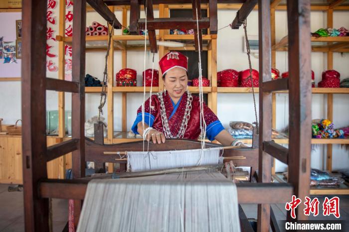 经过多年的发展创新,公司从当初的手工苗绣作坊发展成如今的集刺绣生产、销售、研发、培训、非遗传承、旅游观光等为一体的民族品牌文化企业。图为龙禄颖在操作传统织布机。中新网