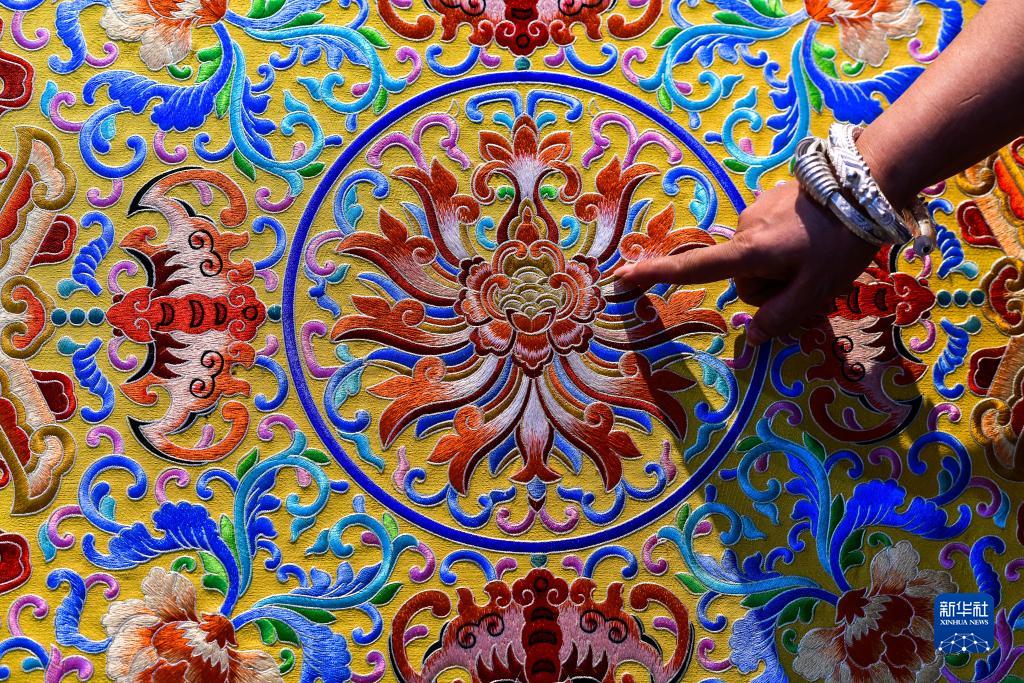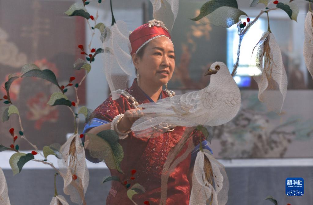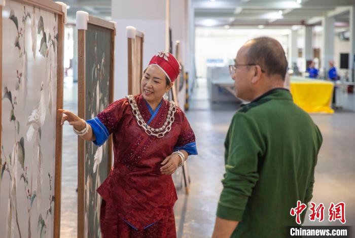 龙禄颖在公司的苗绣产品数字化云生产车间查看刺绣室内装饰画成品。新华社