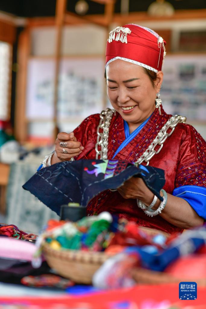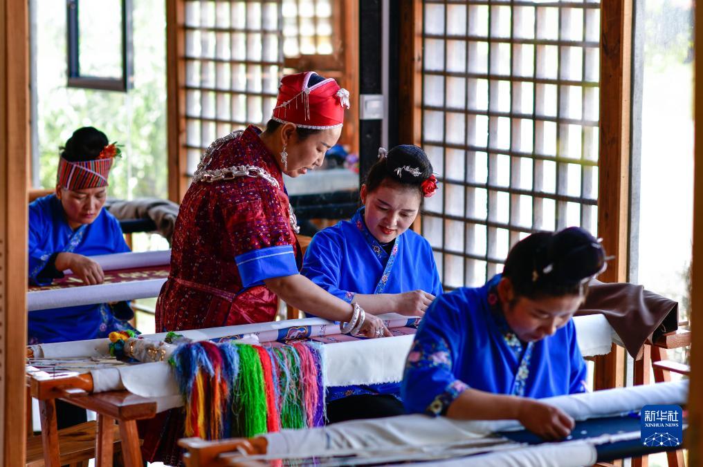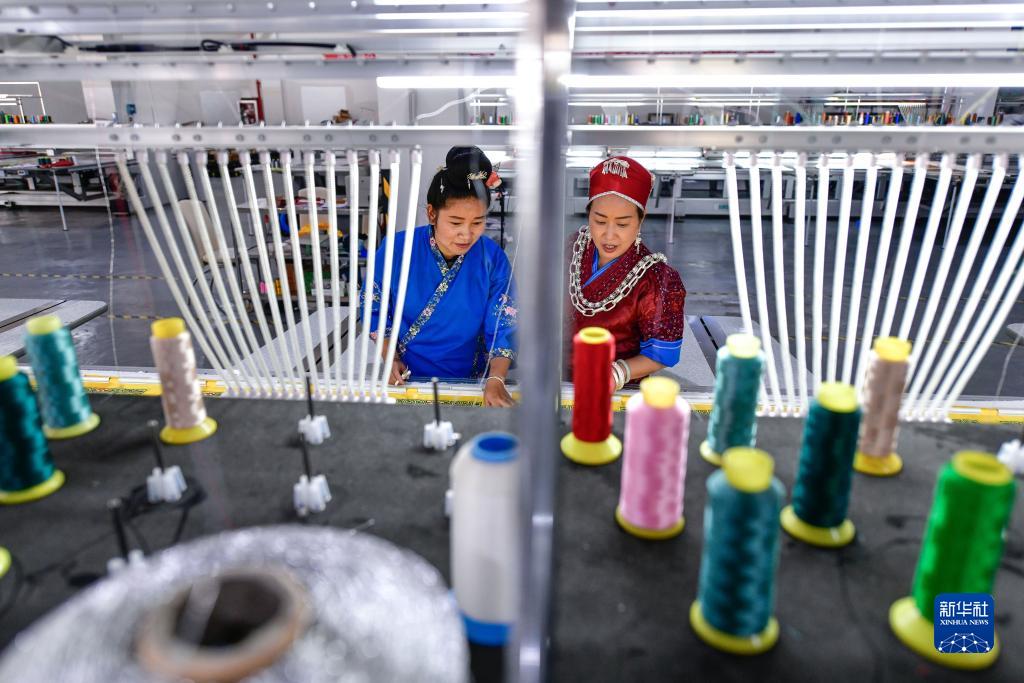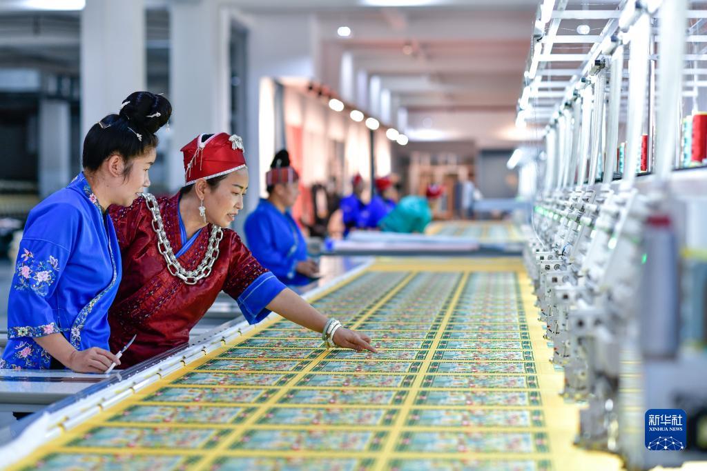 龙禄颖建立传习基地,开展农村妇女就业技能和非遗苗绣技能提升培训,累计培训5800余人,通过苗绣产业,直接带动1200余名苗族绣娘在家门口实现就业、增收。图为龙禄颖(左二)与公司员工在手工刺绣车间交流刺绣技艺。新华社