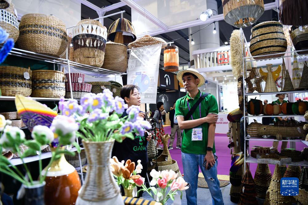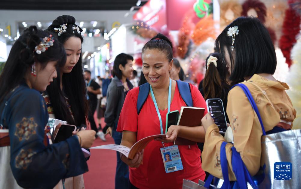 10月23日,外国采购商在饰品展台洽谈业务。新华社