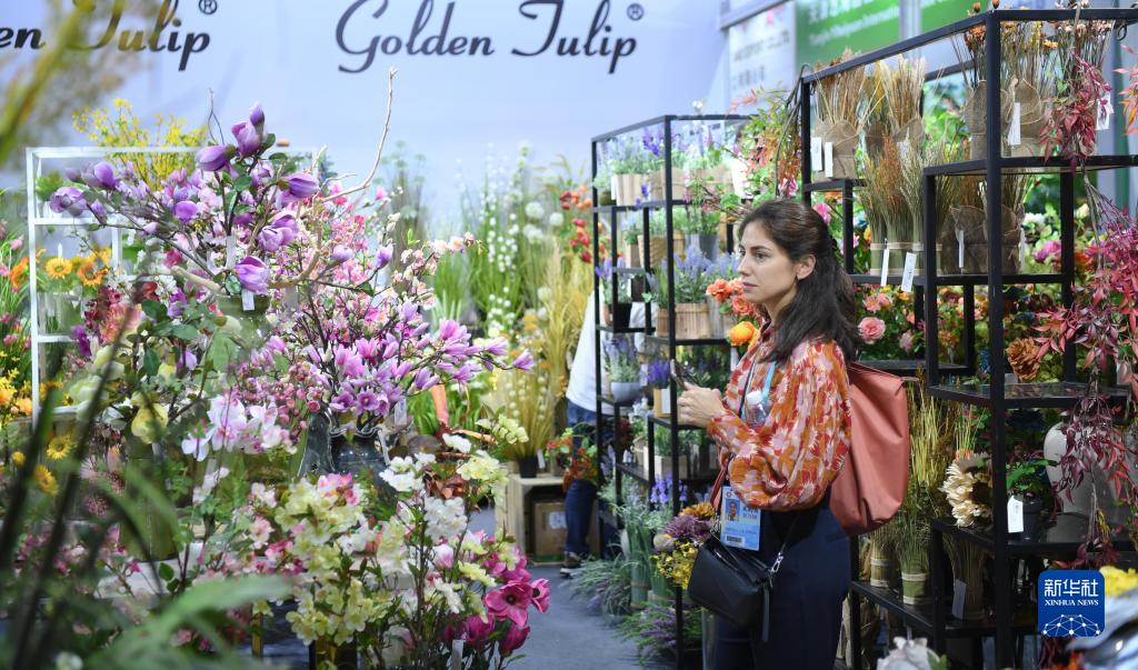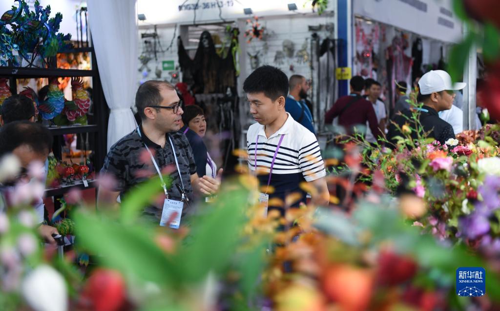 10月23日,海外采购商(左)在仿真花展台洽谈业务。新华社
