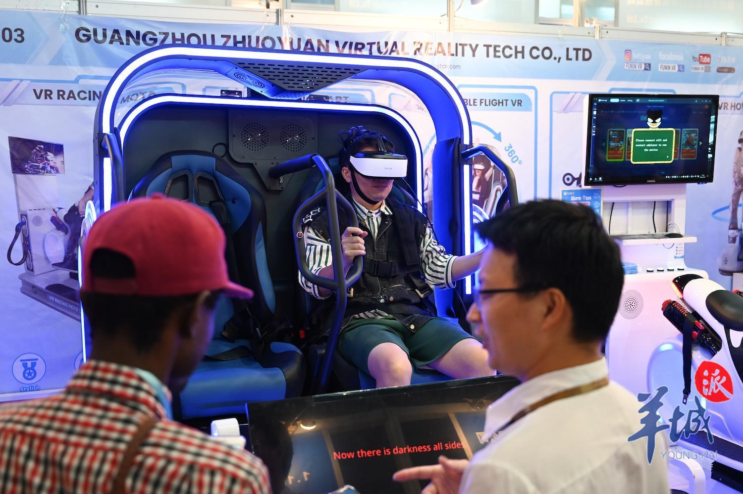 采购商在广交会第二期现场体验VR设备。《羊城晚报》“羊城派”客户端