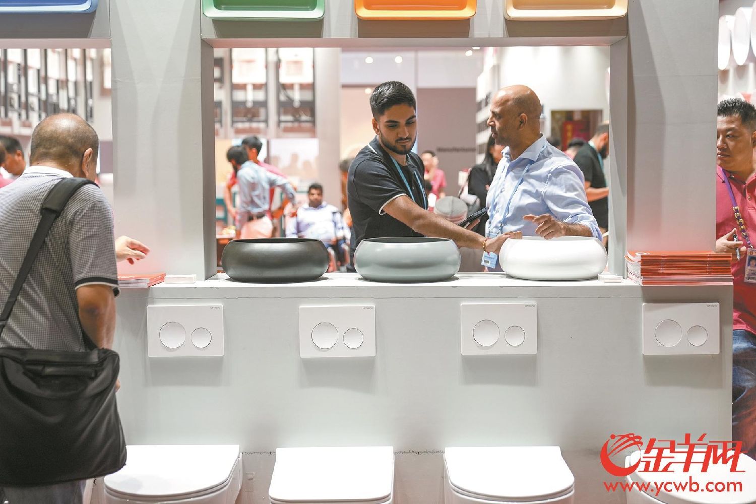 在第134届广交会第二期,海外采购商在展厅内了解产品。金羊网