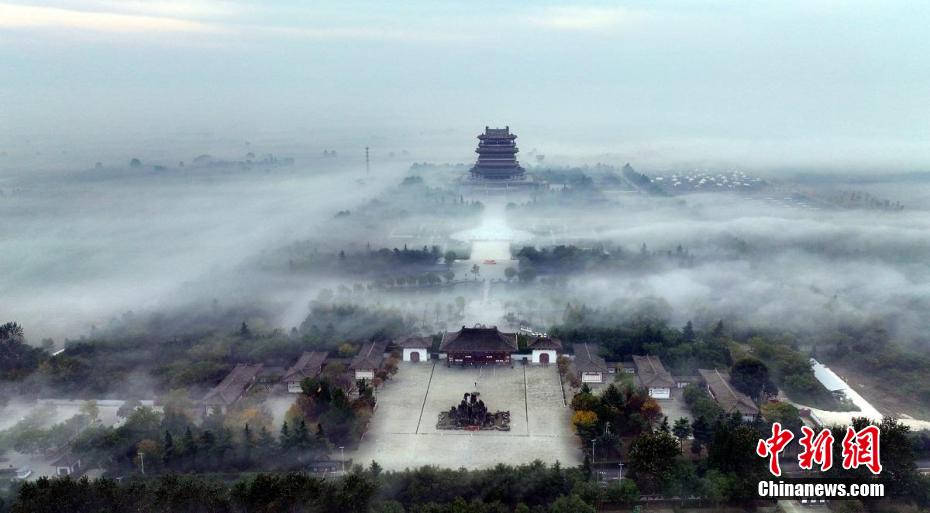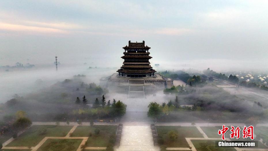 10月23日清晨,位于山西永济的鹳雀楼呈现壮美的平流雾景观。晨雾轻拂,鹳雀楼披上一层神秘的面纱,楼阁若隐若现,如临仙境。云开雾散时,楼阁、绿树逐渐显露,美不胜收。图为鹳雀楼现平流雾景观。中新网