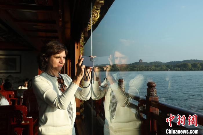 10月23日,在中意世界文化遗产地结好论坛开幕前夕,中国和意大利两国文物部门和专家学者代表参访杭州西湖。“当代马可波罗”们打卡“何处结同心@西湖”文化展,体验“爱情抽签”互动中求签、解签等过程,并前往三潭印月景点,在此品尝西湖特色文创棒冰。图为意大利文物部门和专家学者代表乘坐西湖游船并拍照留念。